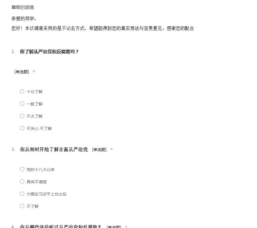 亲爱的同学: 您好!本次调查采用的是不记名方式,希望能得到您的真实想法与宝贵意见。感谢您的配合
