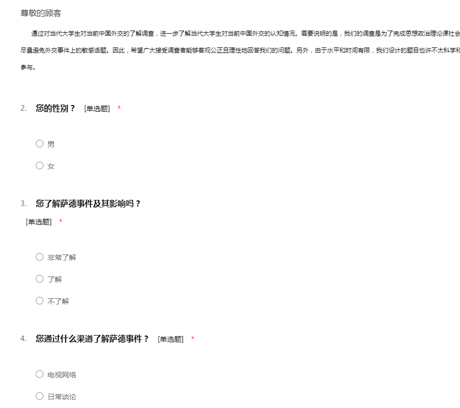 通过对当代大学生对当前中国外交的了解调查,进一步了解当代大学生对当前中国外交的认知情况。需要说明的是,我们的调查是为了完成思想政治理论课社会实践而开展的,调查中不会涉及个人隐私,也会尽量避免外交事件上的敏感话题。因此,希望广大接受调查者能够客观公正且理性地回答我们的问题。另外,由于水平和时间有限,我们设计的题目也许不太科学和正确,欢迎批评指正。在此,谢谢大家的配合和参与。