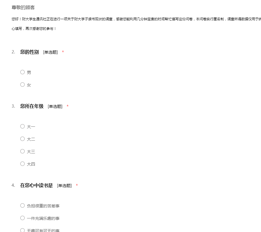 您好!财大学生通讯社正在进行一项关于财大学子读书现状的调查,感谢您能利用几分钟宝贵的时间帮忙填写这份问卷,本问卷实行匿名制,调查所得数据仅用于统计分析,以增进对学生读书现状的了解,请您放心填写,再次感谢您的参与!
