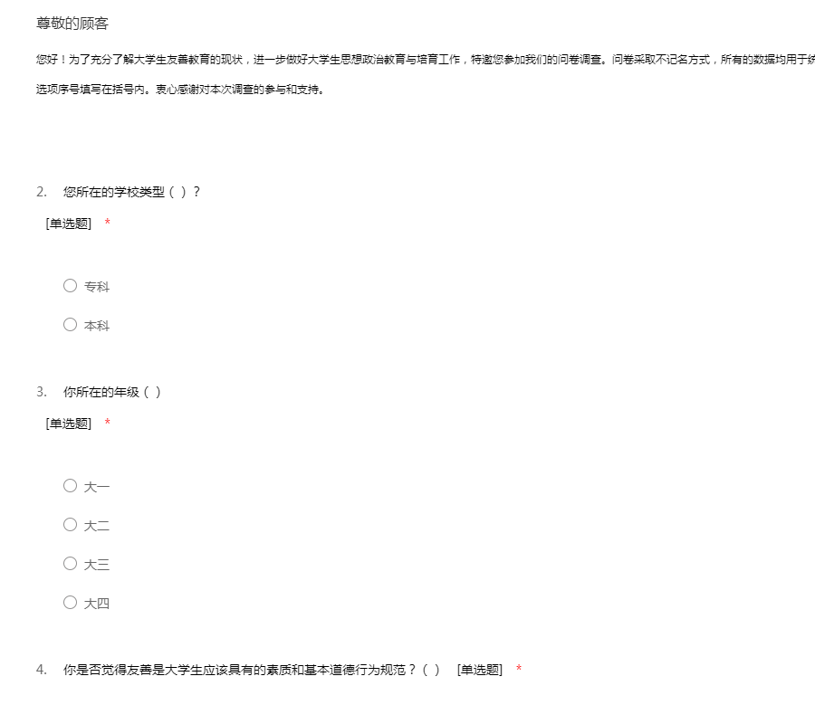 您好!为了充分了解大学生友善教育的现状,进一步做好大学生思想政治教育与培育工作,特邀您参加我们的问卷调查。问卷采取不记名方式,所有的数据均用于统计研究。请您按照实际情况和真实想法将所选的选项序号填写在括号内。衷心感谢对本次调查的参与和支持。