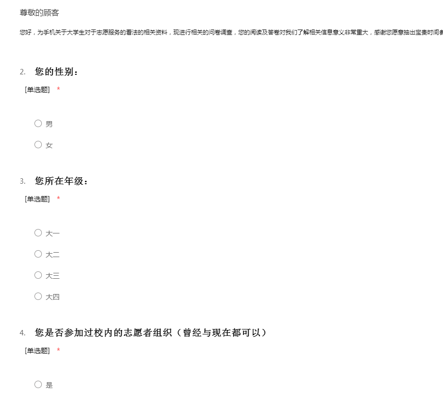 您好,为手机关于大学生对于志愿服务的看法的相关资料,现进行相关的问卷调查,您的阅读及答卷对我们了解相关信息意义非常重大,感谢您愿意抽出宝贵时间参加本次问卷。
