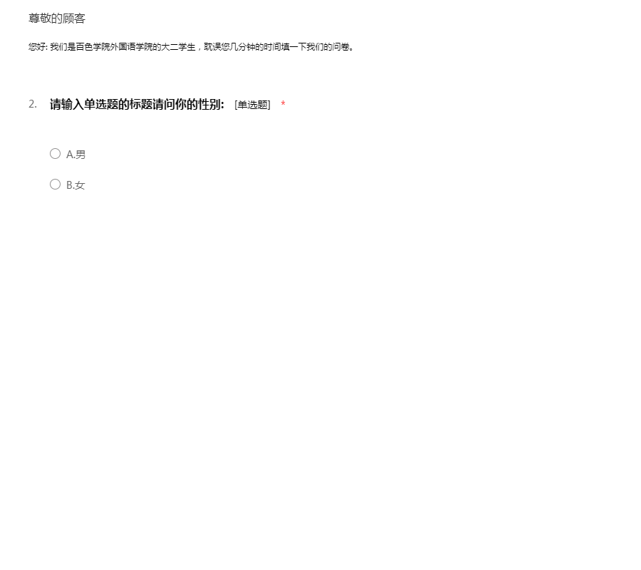 您好: 我们是百色学院外国语学院的大二学生,耽误您几分钟的时间填一下我们的问卷。