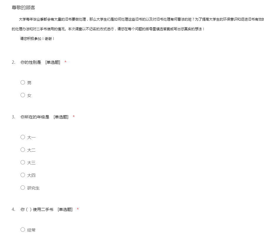 大学每年毕业季都会有大量的旧书要做处理,那么大学生们是如何处理这些旧书的以及对旧书处理有何看法的呢?为了提高大学生的环保意识和促进旧书有效的再次使用,本次的调查问卷将调查大学生对旧书的处理办法和对二手书使用的情况。本次调查以不记名的方式进行,请您在每个问题的括号里填选答案或写出您真实的想法! 请您积极参加!谢谢!