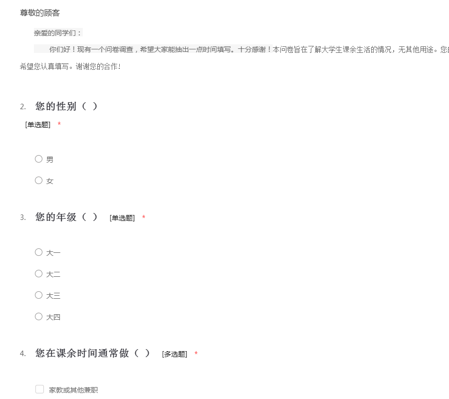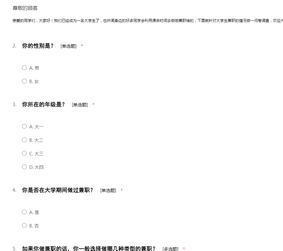 亲爱的同学们,大家好!我们已经成为一名大学生了,也听闻身边的好多同学会利用课余时间去做做兼职啥的,下面就针对大学生兼职的情况做一问卷调查,欢迎大家填写哦!