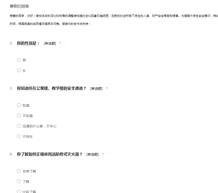 亲爱的同学,你好!高校体改的深化和布局的调整使校园社会化现象日趋明显,在新的社会形势下学生的人身、财产安全常受到侵害。为提高大学生安全意识,特此设计了这份调查。希望你抽出几分钟的宝贵时间时间,根据自身的实际情况填写本问卷。感谢你的合作与支持!
