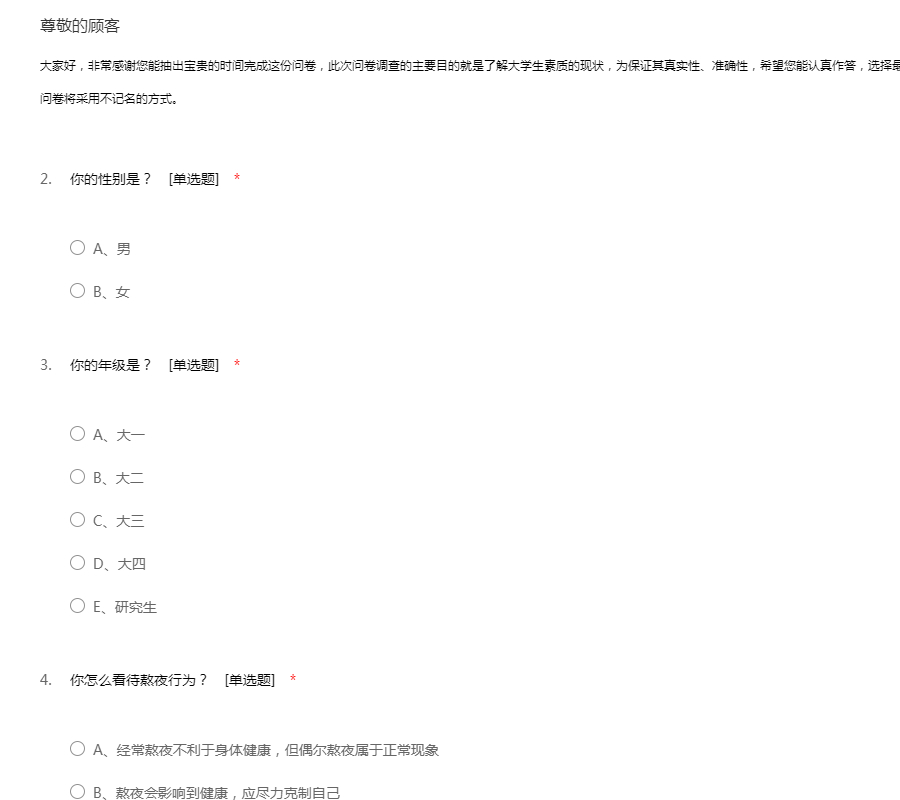 大家好,非常感谢您能抽出宝贵的时间完成这份问卷,此次问卷调查的主要目的就是了解大学生素质的现状,为保证其真实性、准确性,希望您能认真作答,选择最贴近实际情况的一项,为保障您的隐私权,本次问卷将采用不记名的方式。