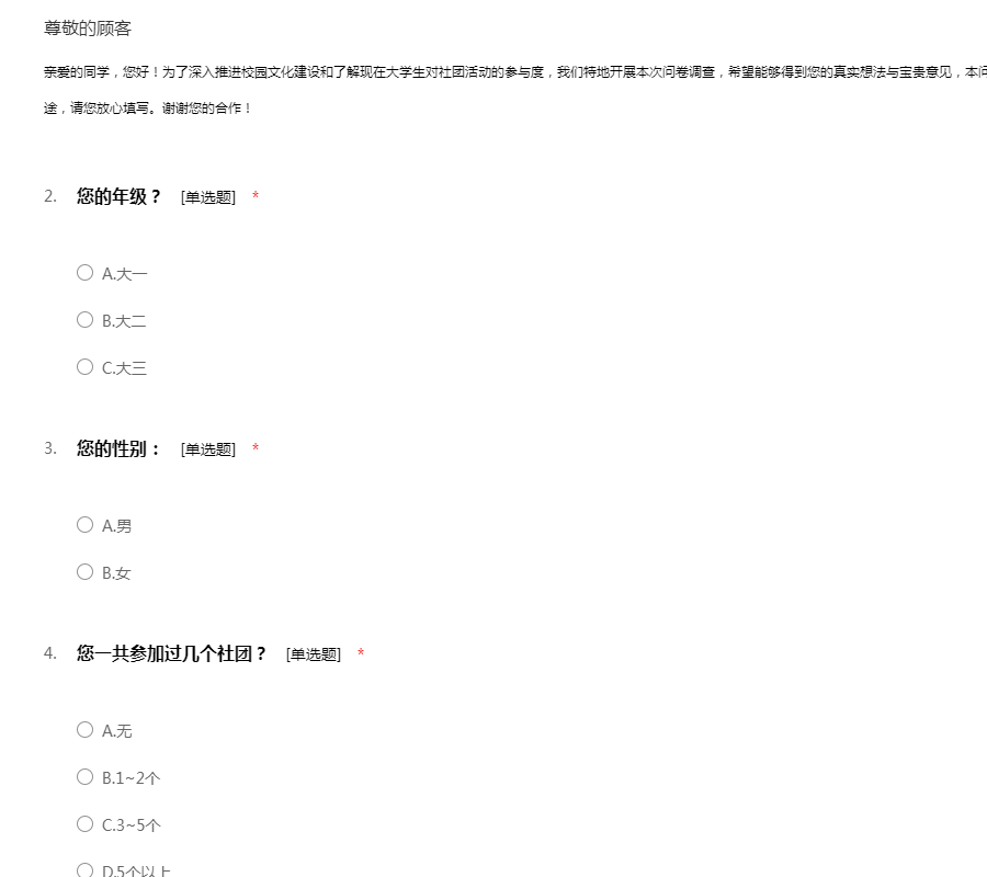 亲爱的同学,您好!为了深入推进校园文化建设和了解现在大学生对社团活动的参与度,我们特地开展本次问卷调查,希望能够得到您的真实想法与宝贵意见,本问卷所填信息仅用于统计分析,不做任何其他用途,请您放心填写。谢谢您的合作!