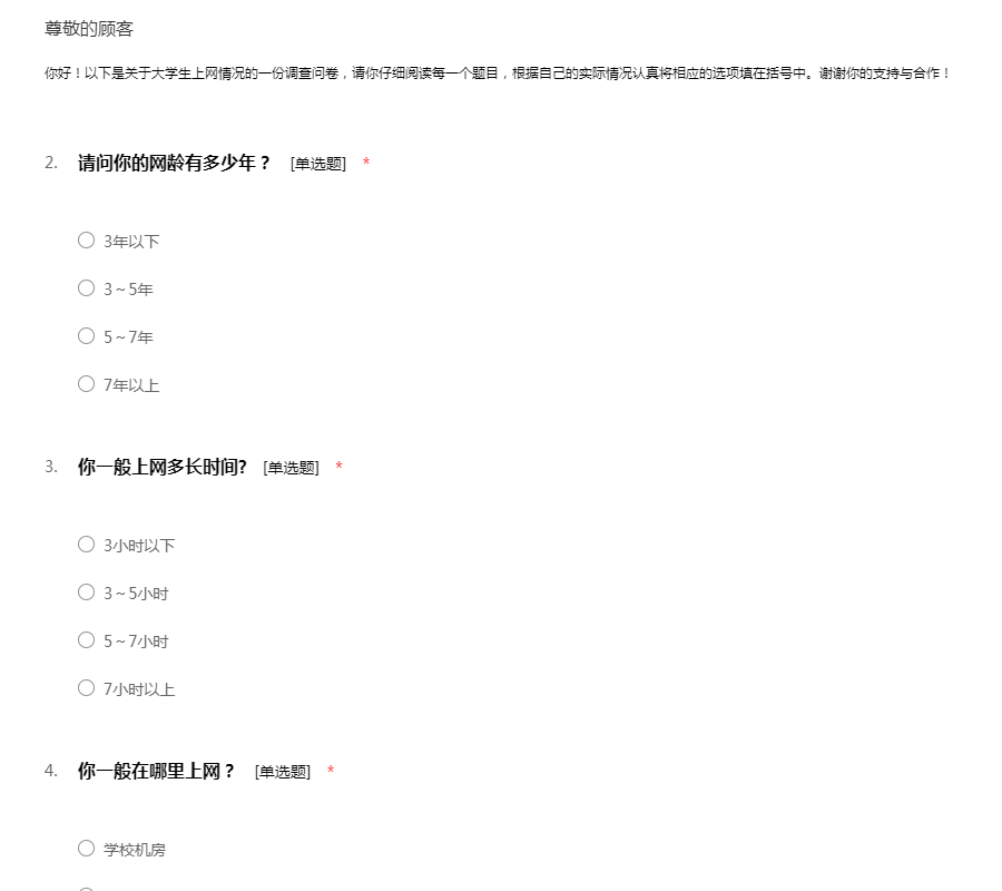你好!以下是关于大学生上网情况的一份调查问卷,请你仔细阅读每一个题目,根据自己的实际情况认真将相应的选项填在括号中。谢谢你的支持与合作!