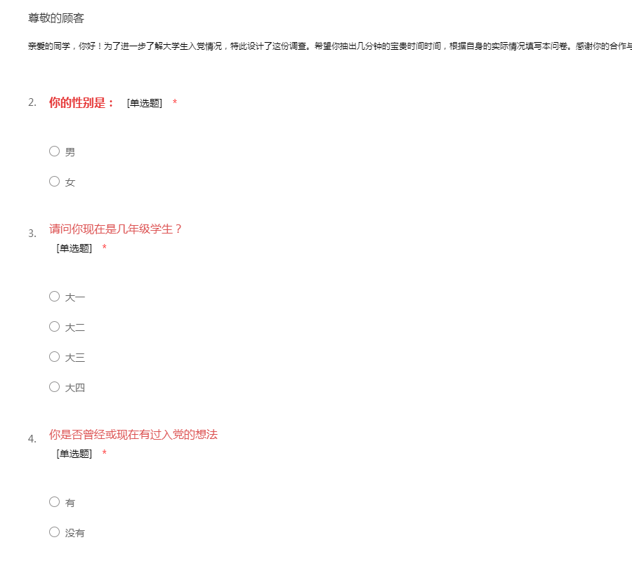 亲爱的同学,你好!为了进一步了解大学生入党情况,特此设计了这份调查。希望你抽出几分钟的宝贵时间时间,根据自身的实际情况填写本问卷。感谢你的合作与支持!