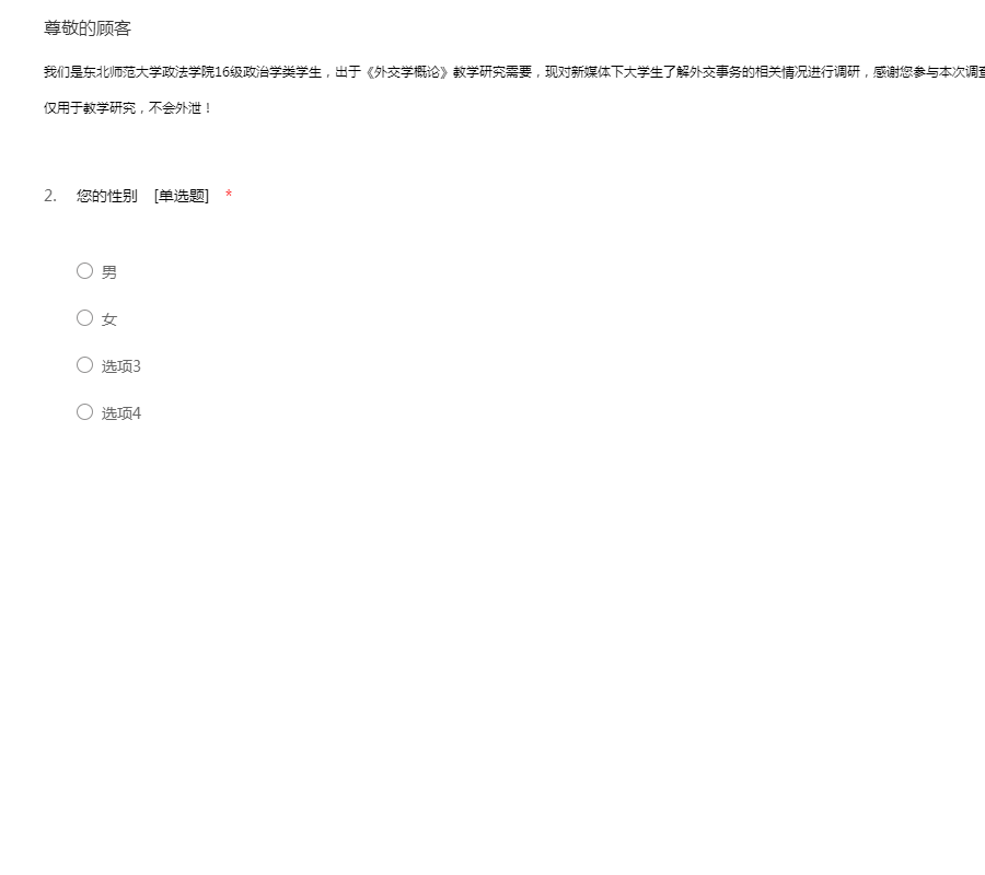 我们是东北师范大学政法学院16级政治学类学生,出于《外交学概论》教学研究需要,现对新媒体下大学生了解外交事务的相关情况进行调研,感谢您参与本次调查,我们保证此次采用匿名方式,调查所得数据仅用于教学研究,不会外泄!