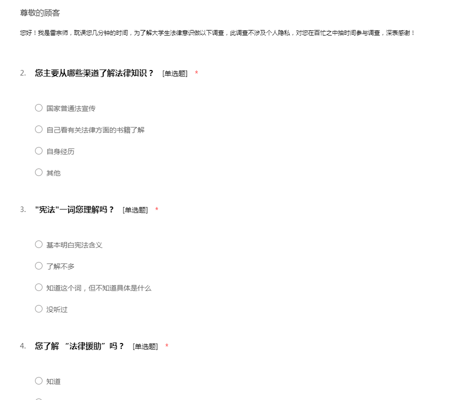 您好!我是雷宗师,耽误您几分钟的时间,为了解大学生法律意识做以下调查,此调查不涉及个人隐私,对您在百忙之中抽时间参与调查,深表感谢!
