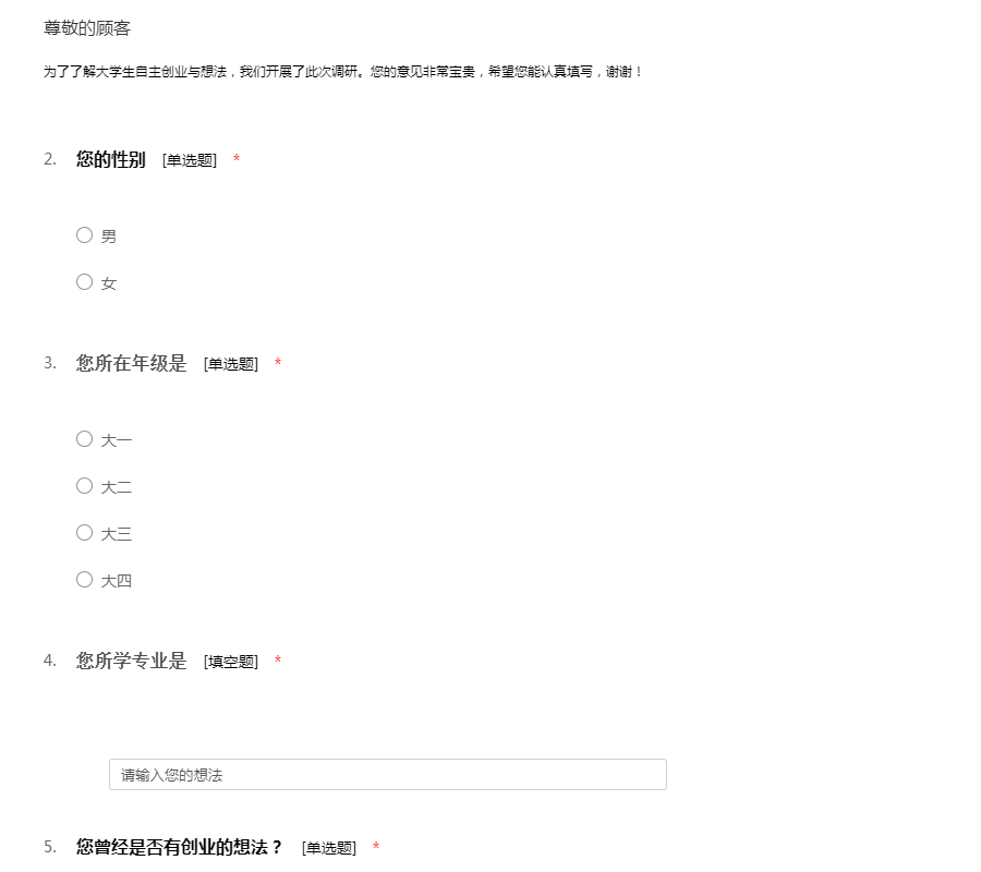 为了了解大学生自主创业与想法,我们开展了此次调研。您的意见非常宝贵,希望您能认真填写,谢谢!