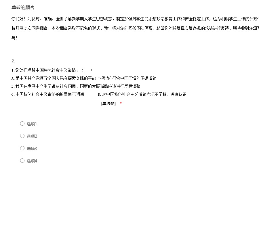 你们好!为及时、准确、全面了解新学期大学生思想动态,制定加强对学生的思想政治教育工作和安全稳定工作,也为明确学生工作的针对性和目的性,促进同学们的发展和成才,特开展此次问卷调查。本次调查采取不记名的形式,我们将对您的回答予以保密,希望您能将最真实最客观的想法进行反馈,期待收到您填写的完整问卷,感谢您的参与!
