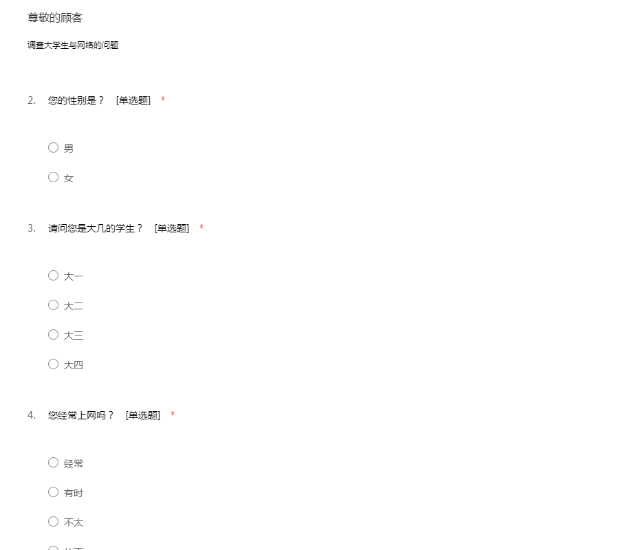 网络与大学生生活息息相关,作为大学生的我们可考虑过网络对我们的影响,为了了解网络对当代大学生的影响,我们做了一个关于网络对于大学生学习生活的影响情况调查问卷。通过调查,我们想了解一下我校不同年级的同学有着怎样的上网习惯以及网络对我们生活影响情况,希望能通过调查结果真实的反映出网络对我们的帮助以及有害的地方,使我们更加合理的利用它而不是被它奴役。非常希望您能配合,谢谢您的参与!