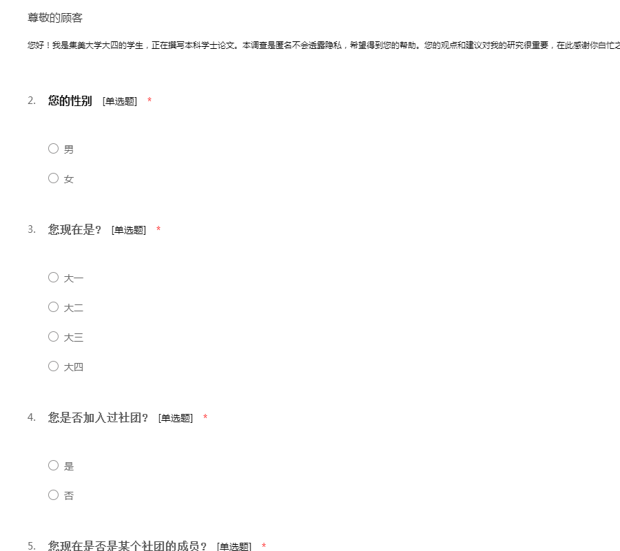 您好!我是集美大学大四的学生,正在撰写本科学士论文。本调查是匿名不会透露隐私,希望得到您的帮助。您的观点和建议对我的研究很重要,在此感谢你白忙之中参与本调查!