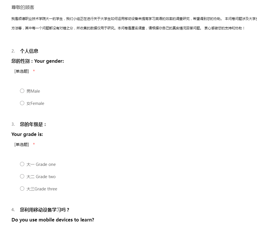 我是顺德职业技术学院大一的学生,我们小组正在进行关于大学生如何运用移动设备来提高学习英语的效率的调查研究,希望得到您的协助。 本问卷问题涉及大学生利用移动设备进行学习英语的基本情况、学习方法等,其中每一个问题都没有对错之分,所收集的数据仅用于研究。本问卷是匿名调查,请根据你自己的真实情况回答问题。 衷心感谢您的支持和协助!