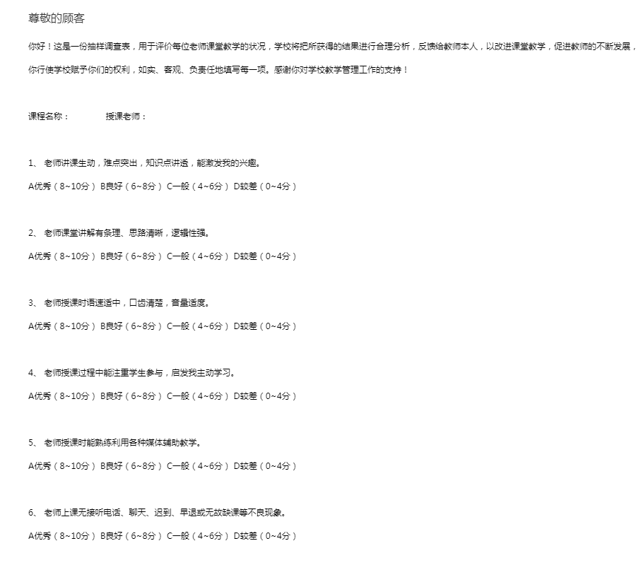 你好!这是一份抽样调查表,用于评价每位老师课堂教学的状况,学校将把所获得的结果进行合理分析,反馈给教师本人,以改进课堂教学,促进教师的不断发展,提高教学质量。这里采用不记名方式,因此希望你行使学校赋予你们的权利,如实、客观、负责任地填写每一项。感谢你对学校教学管理工作的支持!课程名称: 授课老师:1、 老师讲课生动,难点突出,知识点讲透,能激发我的兴趣。A优秀(8~10分) B良好(6~8分) C一般(4~6分) D较差(0~4分)2、 老师课堂讲解有条理、思路清晰,逻辑性强。A优秀(8~10分) B良好(6~8分) C一般(4~6分) D较差(0~4分)3、 老师授课时语速适中,口齿清楚,音量适度。A优秀(8~10分) B良好(6~8分) C一般(4~6分) D较差(0~4分)4、 老师授课过程中能注重学生参与,启发我主动学习。A优秀(8~10分) B良好(6~8分) C一般(4~6分) D较差(0~4分)5、 老师授课时能熟练利用各种媒体辅助教学。A优秀(8~10分) B良好(6~8分) C一般(4~6分) D较差(0~4分)6、 老师上课无接听电话、聊天、迟到、早退或无故缺课等不良现象。A优秀(8~10分) B良好(6~8分) C一般(4~6分) D较差(0~4分)7、 老师在授课时无经常偏离主要内容,扯大炮等不良现象。A优秀(8~10分) B良好(6~8分) C一般(4~6分) D较差(0~4分)8、 老师在授课时内容熟练,讲解准确,没有出现照着书本或者准备好的课件念的情况。A优秀(8~10分) B良好(6~8分) C一般(4~6分) D较差(0~4分)9、 授课内容实践性强,实用性强,注意讲练结合,且及时补充最新知识。A优秀(8~10分) B良好(6~8分) C一般(4~6分) D较差(0~4分)10、 老师的每一堂课都让你有所收获。A优秀(8~10分) B良好(6~8分) C一般(4~6分) D较差(0~4分)11、 老师比较公正,没有任何体罚或歧视行为。A优秀(8~10分) B良好(6~8分) C一般(4~6分) D较差(0~4分)12、 实训课程要点明确,指导到位。A优秀(8~10分) B良好(6~8分) C一般(4~6分) D较差(0~4分)13、 老师在课余(或实训课程)及时、耐心的辅导。A优秀(8~10分) B良好(6~8分) C一般(4~6分) D较差(0~4分)14、 作业(练习)数量与难度适中,且可以帮助课程知识消化。A优秀(8~10分) B良好(6~8分) C一般(4~6分) D较差(0~4分)15、 老师批改作业认真、细致,对我有帮助。A优秀(8~10分) B良好(6~8分) C一般(4~6分) D较差(0~4分)16、 你认为该老师最让你欣赏的有点是:17、 你认为该老师需要改进的方面是:18、 请您对老师及学校工作提出意见或建议: