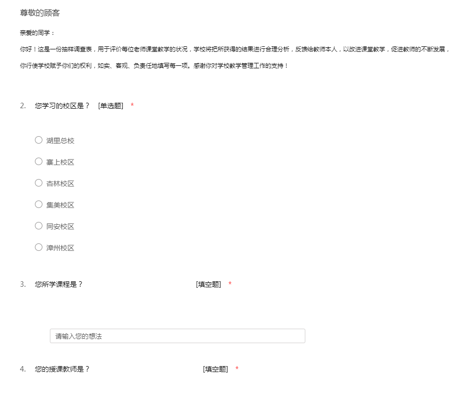 亲爱的同学:你好!这是一份抽样调查表,用于评价每位老师课堂教学的状况,学校将把所获得的结果进行合理分析,反馈给教师本人,以改进课堂教学,促进教师的不断发展,提高教学质量。这里采用不记名方式,因此希望你行使学校赋予你们的权利,如实、客观、负责任地填写每一项。感谢你对学校教学管理工作的支持!