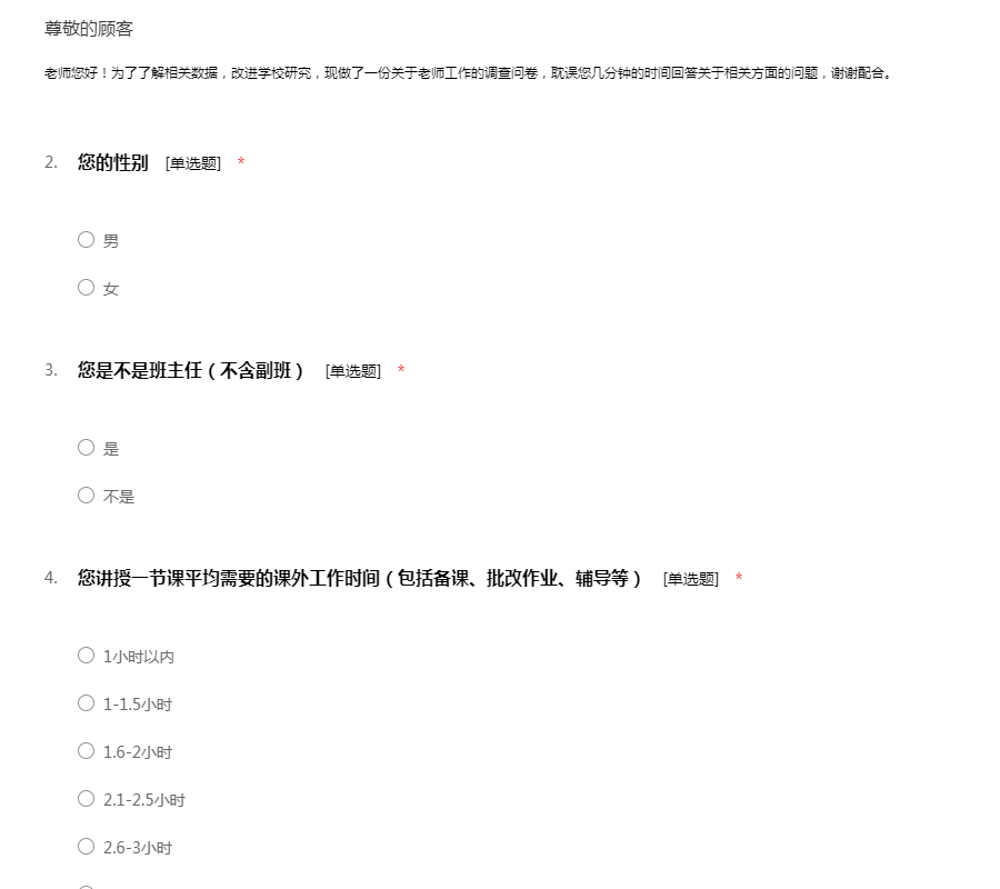 老师您好!为了了解相关数据,改进学校研究,现做了一份关于老师工作的调查问卷,耽误您几分钟的时间回答关于相关方面的问题,谢谢配合。