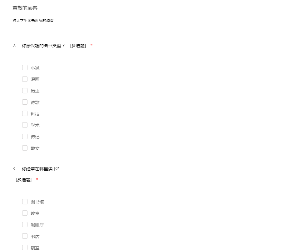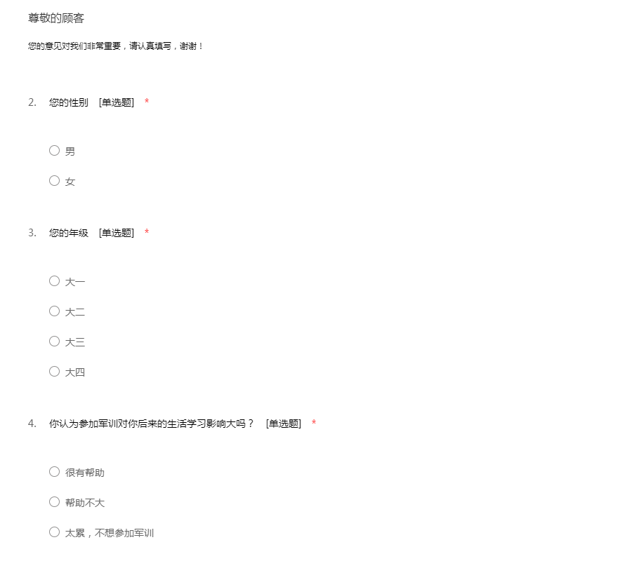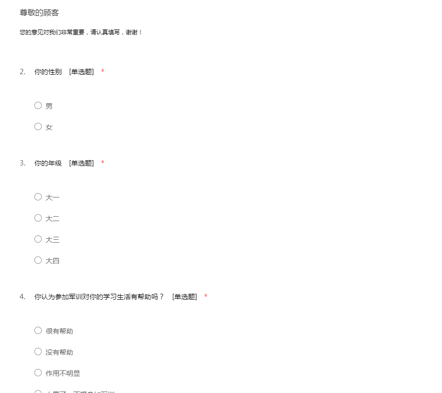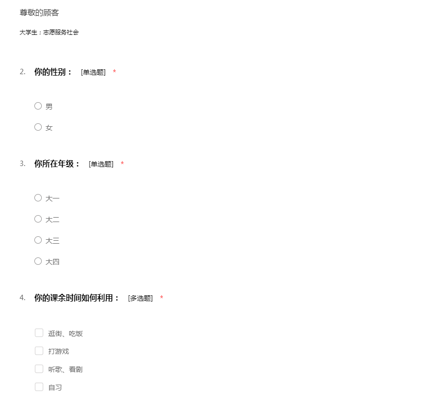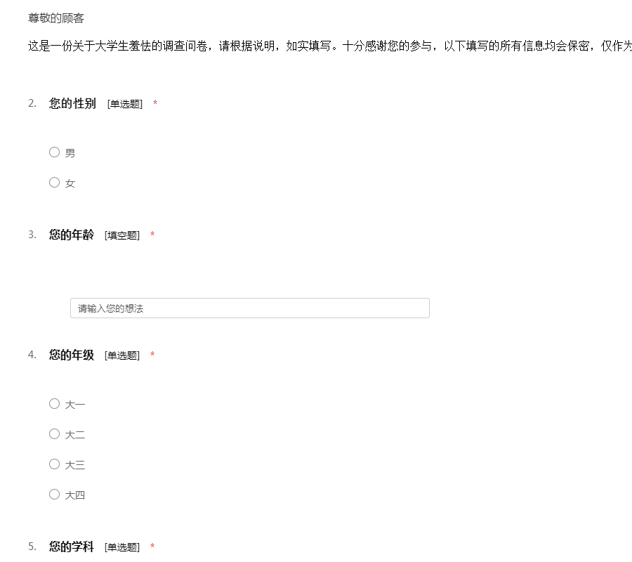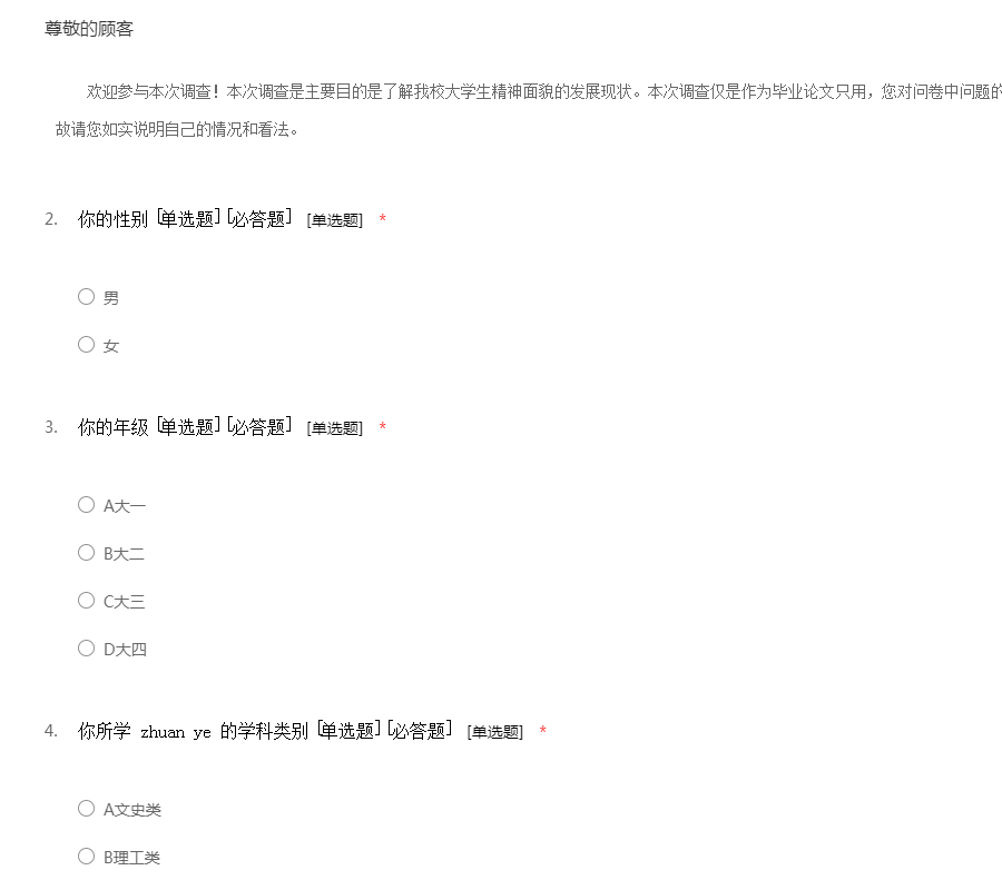 欢迎参与本次调查!本次调查是主要目的是了解我校大学生精神面貌的发展现状。本次调查仅是作为毕业论文只用,您对问卷中问题的回答无对错、好坏之分,也不必署名,故请您如实说明自己的情况和看法。