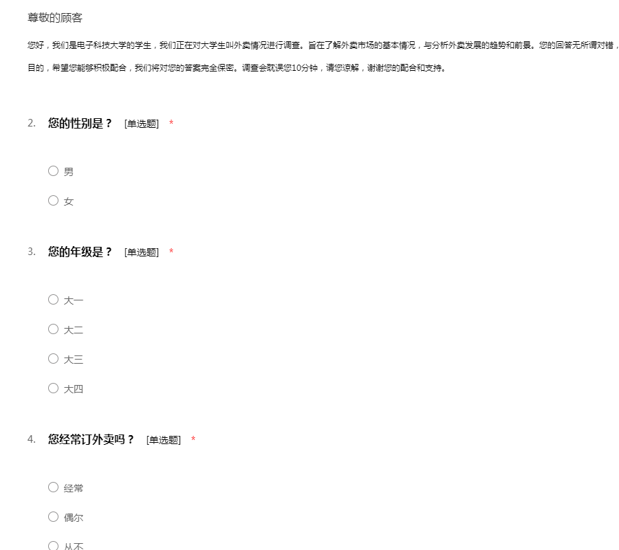 您好,我们是电子科技大学的学生,我们正在对大学生叫外卖情况进行调查。旨在了解外卖市场的基本情况,与分析外卖发展的趋势和前景。您的回答无所谓对错,只要您提供您的真实情况就达到我们这次调查的目的,希望您能够积极配合,我们将对您的答案完全保密。调查会耽误您10分钟,请您谅解,谢谢您的配合和支持。