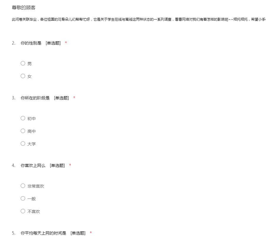 此问卷关联毕业,各位祖国的花骨朵儿们帮帮忙呀,它是关于学生在线与离线这两种状态的一系列调查,看看网络对我们有着怎样的影响呢~~拜托拜托,希望小手一戳填写并转发O(∩_∩)O~