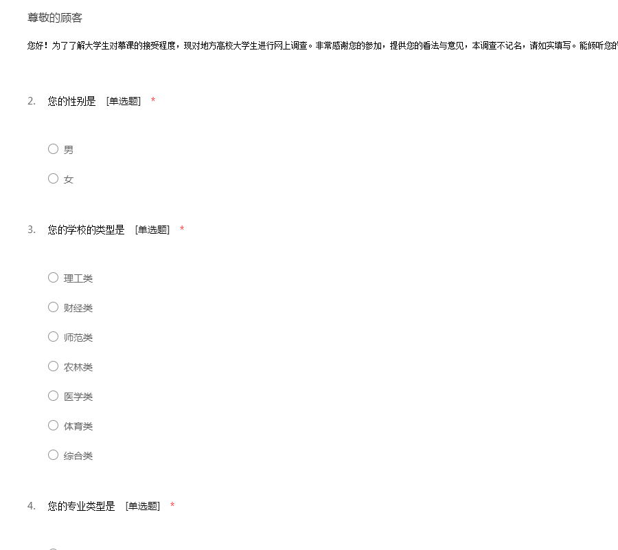 您好!为了了解大学生对慕课的接受程度,现对地方高校大学生进行网上调查。非常感谢您的参加,提供您的看法与意见,本调查不记名,请如实填写。能倾听您的意见,我们感到十分荣幸。谢谢!