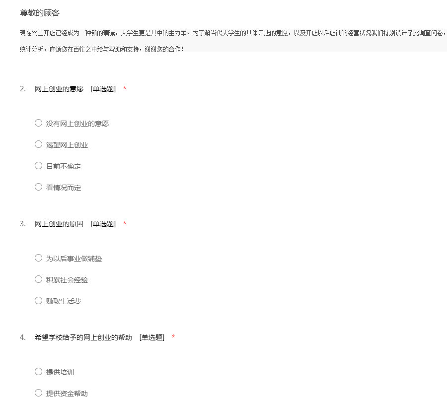 现在网上开店已经成为一种新的潮流,大学生更是其中的主力军,为了解当代大学生的具体开店的意愿,以及开店以后店铺的经营状况我们特别设计了此调查问卷,此调查不记姓名,并且您所提供的数据将只用于统计分析,麻烦您在百忙之中给与帮助和支持,谢谢您的合作!