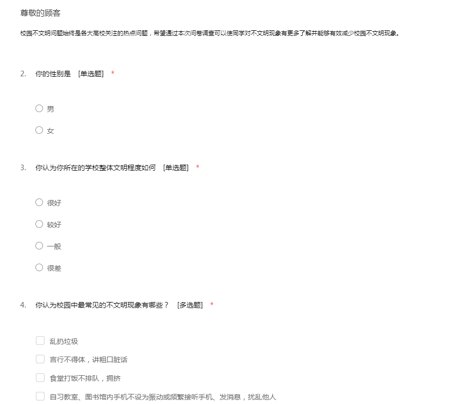 校园不文明问题始终是各大高校关注的热点问题,希望通过本次问卷调查可以使同学对不文明现象有更多了解并能够有效减少校园不文明现象。