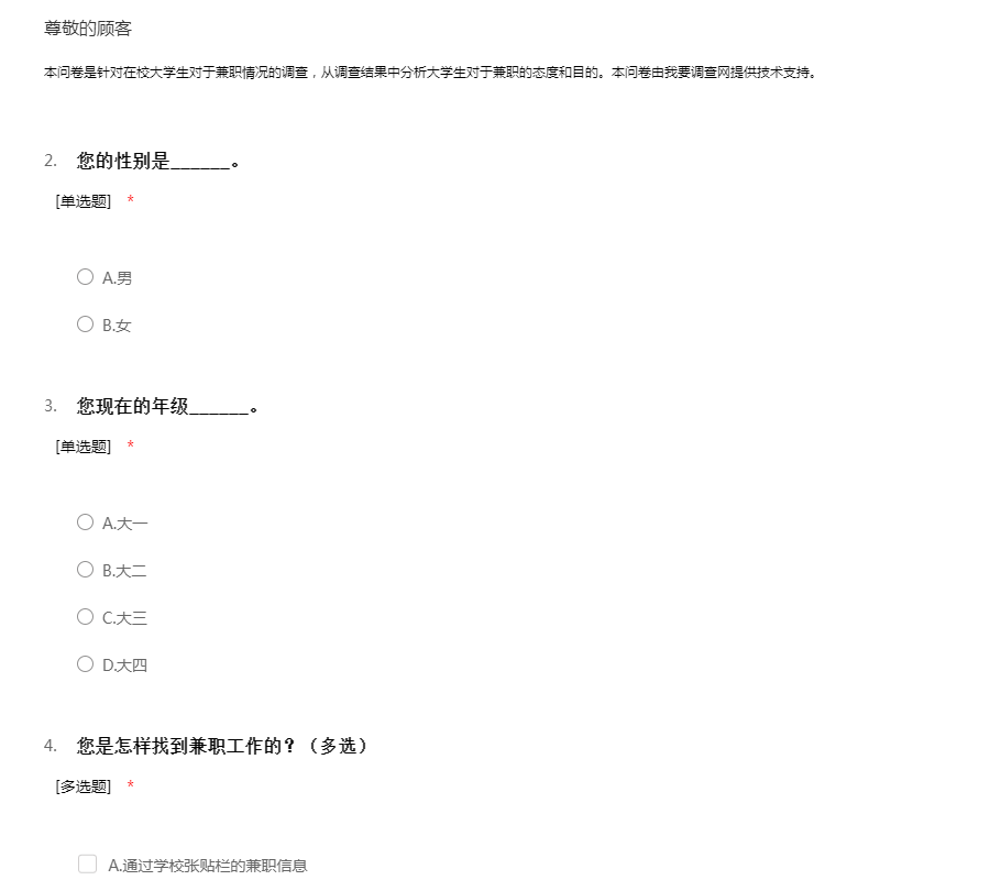 本问卷是针对在校大学生对于兼职情况的调查,从调查结果中分析大学生对于兼职的态度和目的。本问卷由我要调查网提供技术支持。