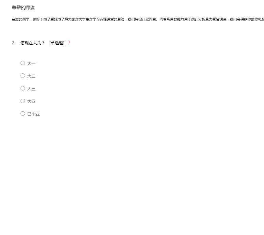 亲爱的同学:你好!为了更好地了解大家对大学生对学习英语课堂的看法,我们特设计此问卷。问卷所用数据均用于统计分析且为匿名调查,我们会保护你的隐私权,望如实回答。非常感谢你的支持。