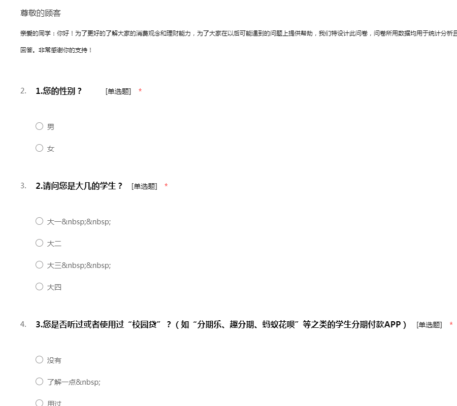 亲爱的同学:你好!为了更好的了解大家的消费观念和理财能力,为了大家在以后可能遇到的问题上提供帮助,我们特设计此问卷,问卷所用数据均用于统计分析且为匿名调查,我们会保护好你的隐私权,望如实回答。非常感谢你的支持!