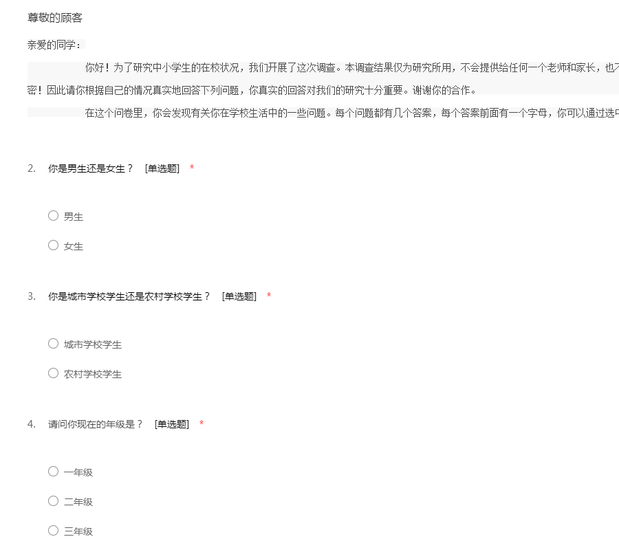 亲爱的同学: 你好!为了研究中小学生的在校状况,我们开展了这次调查。本调查结果仅为研究所用,不会提供给任何一个老师和家长,也不会让其他人看到,我们将对结果严格保密!因此请你根据自己的情况真实地回答下列问题,你真实的回答对我们的研究十分重要。谢谢你的合作。 在这个问卷里,你会发现有关你在学校生活中的一些问题。每个问题都有几个答案,每个答案前面有一个字母,你可以通过选中的方式来进行作答。