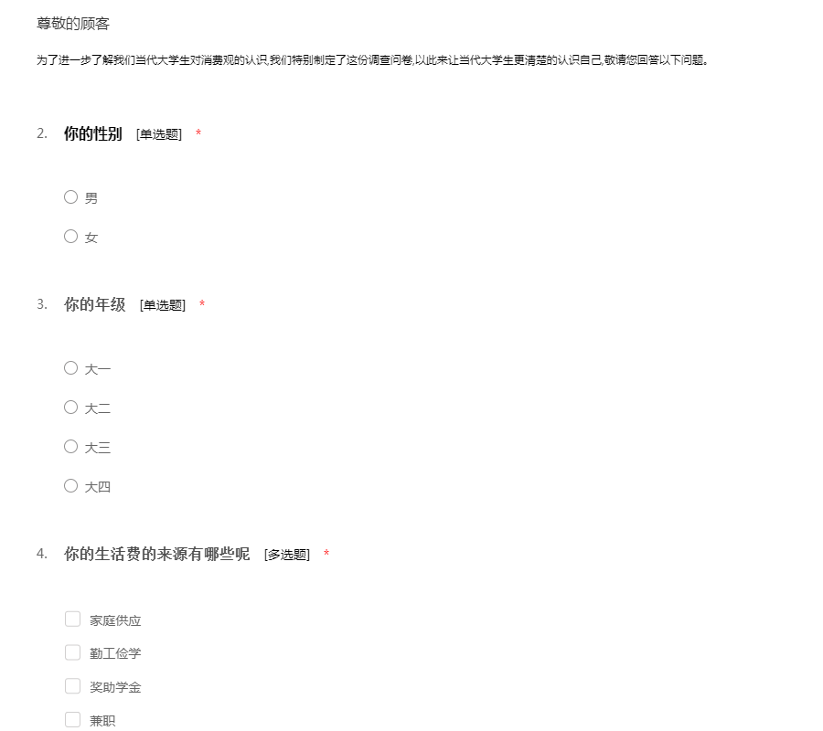 为了进一步了解我们当代大学生对消费观的认识,我们特别制定了这份调查问卷,以此来让当代大学生更清楚的认识自己,敬请您回答以下问题。