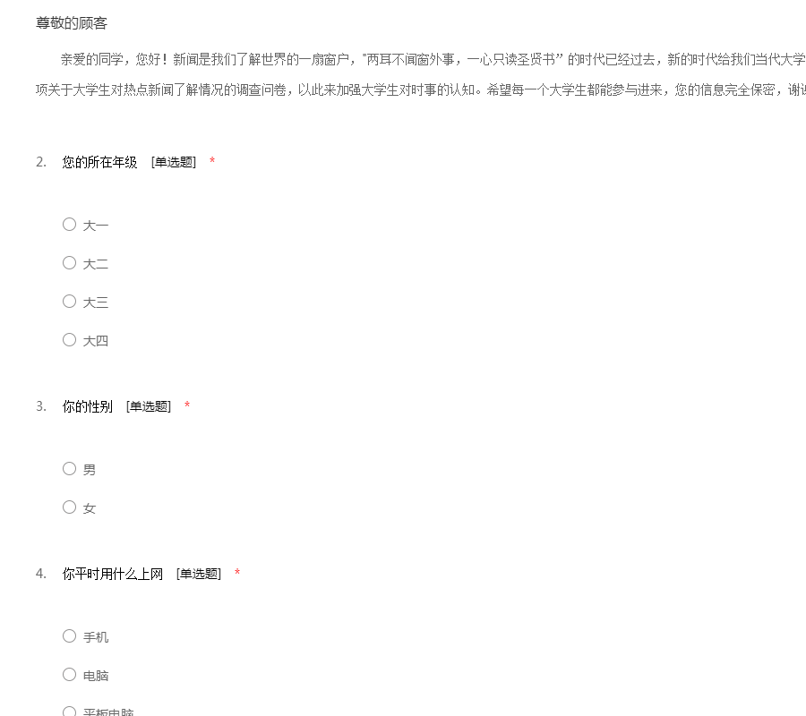 亲爱的同学,您好!新闻是我们了解世界的一扇窗户,"两耳不闻窗外事,一心只读圣贤书”的时代已经过去,新的时代给我们当代大学生提出了更高的要求。为此,我们做了一项关于大学生对热点新闻了解情况的调查问卷,以此来加强大学生对时事的认知。希望每一个大学生都能参与进来,您的信息完全保密,谢谢您的合作!