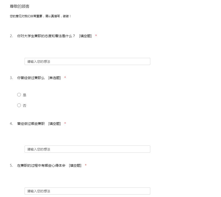 我们正在做关于大学生兼职的调查,您的意见对我们很重要,麻烦您抽一点点时间为我们填一下问卷,非常谢感谢。