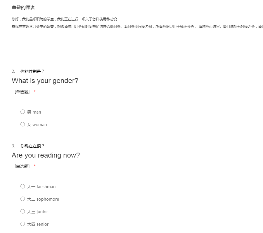 您好,我们是顺职院的学生,我们正在进行一项关于怎样使用移动设备提高英语学习效率的调查,想邀请您用几分钟时间帮忙填答这份问卷。本问卷实行匿名制,所有数据只用于统计分析, 请您放心填写。题目选项无对错之分,请您按自己的实际情况填写。谢谢您的帮助。