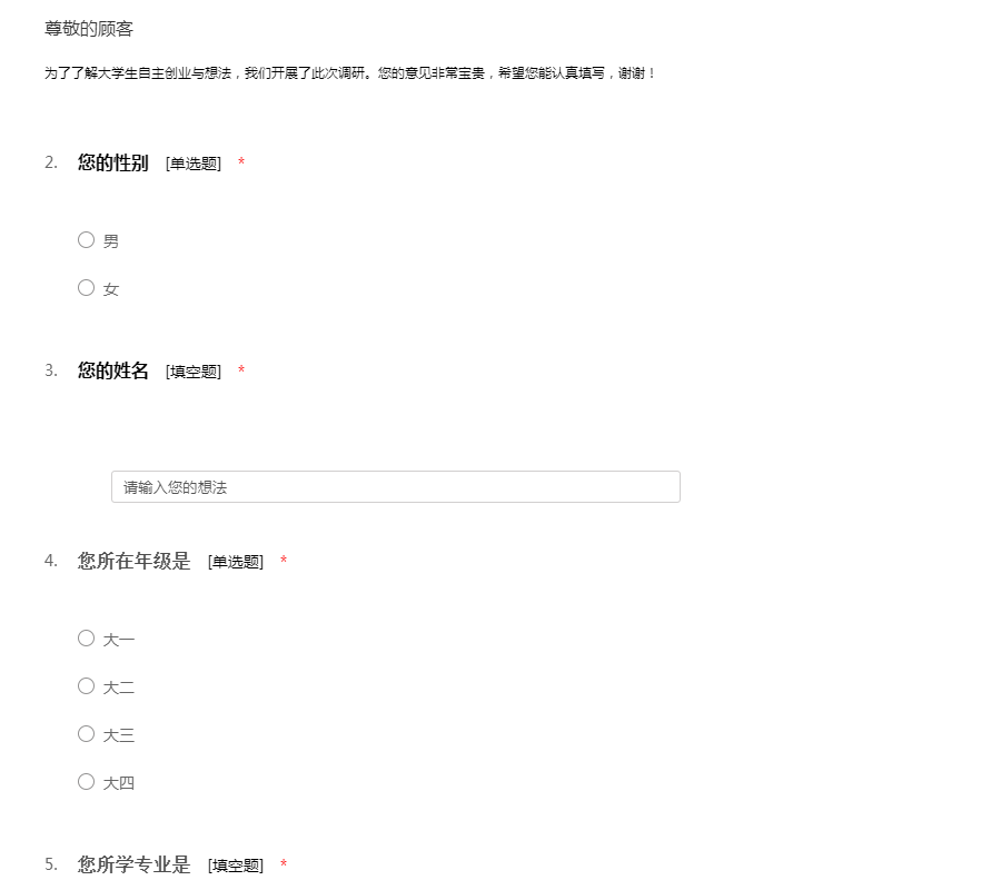 为了了解大学生自主创业与想法,我们开展了此次调研。您的意见非常宝贵,希望您能认真填写,谢谢!