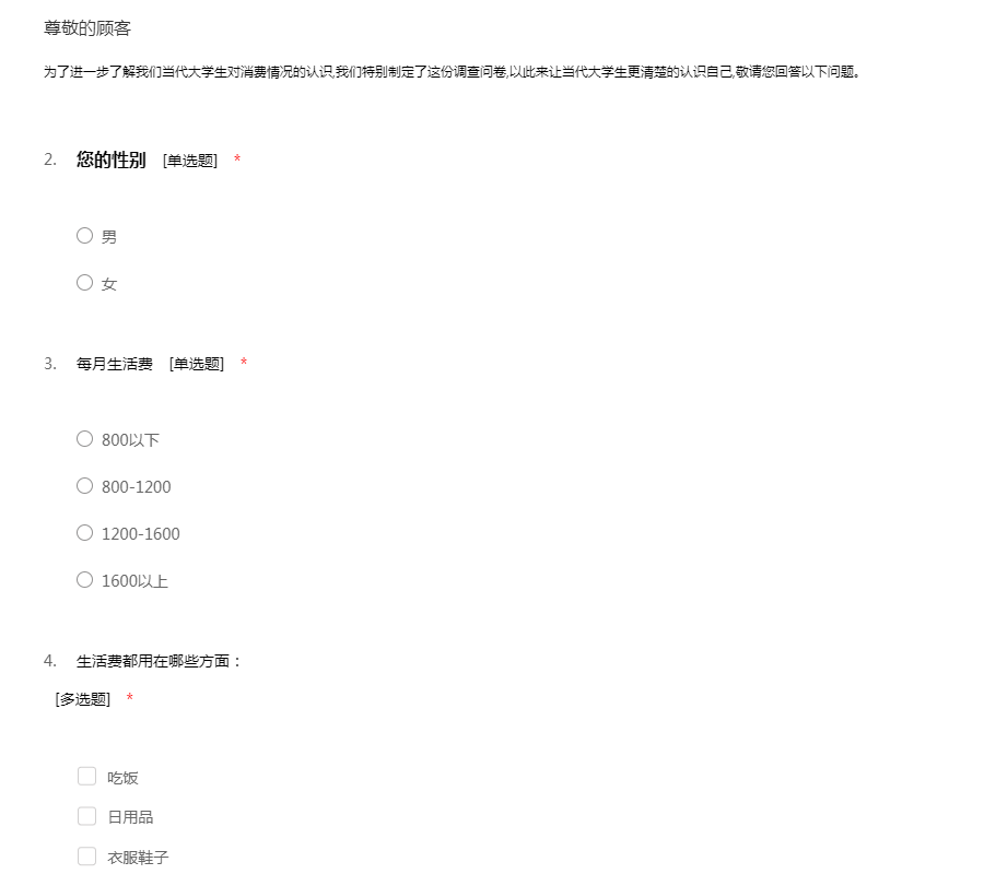 为了进一步了解我们当代大学生对消费情况的认识,我们特别制定了这份调查问卷,以此来让当代大学生更清楚的认识自己,敬请您回答以下问题。