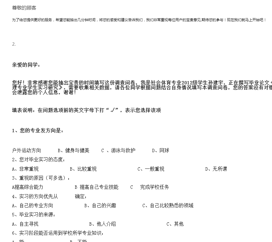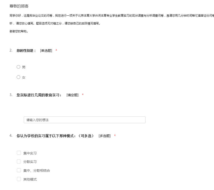 同学你好,这是我毕业论文的问卷,我在进行一项关于北京体育大学休闲体育专业学生教育实习的现状调查与分析调查问卷,恳请您用几分钟时间帮忙填答这份问卷。本问卷实行匿名制,所有数据只用于统计分析, 请您放心填写。题目选项无对错之分,请您按自己的实际情况填写。谢谢您的帮助。