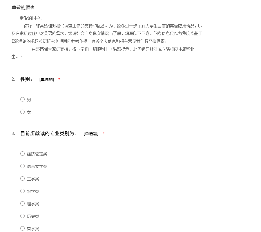 亲爱的同学: 你好!非常感谢对我们调查工作的支持和配合。为了能够进一步了解大学生目前的英语应用情况,以及在求职过程中对英语的需求,烦请结合自身真实情况与了解,填写以下问卷。问卷信息仅作为我院《基于ESP理论的求职英语研究》项目的参考依据,有关个人信息和相关意见我们将严格保密。 由衷感谢大家的支持,祝同学们一切顺利!(温馨提示:此问卷只针对独立院校应往届毕业生。)