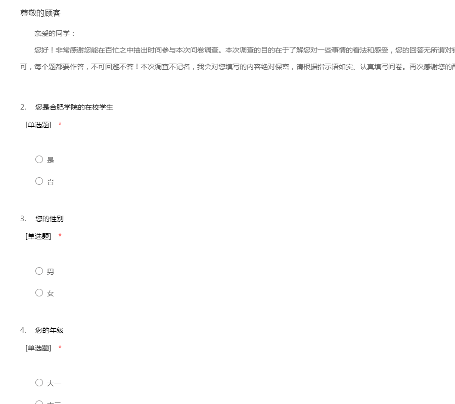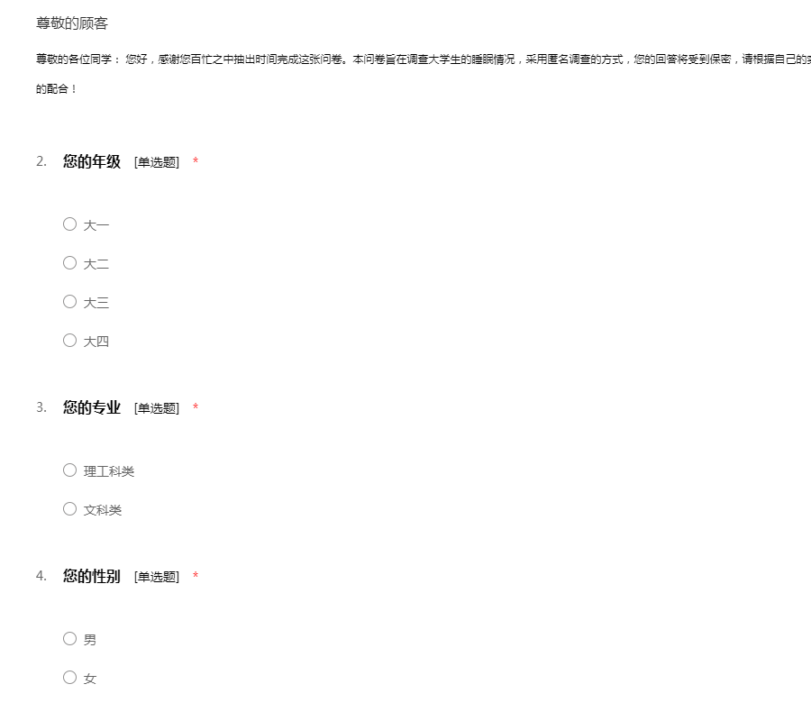 尊敬的各位同学: 您好,感谢您百忙之中抽出时间完成这张问卷。本问卷旨在调查大学生的睡眠情况,采用匿名调查的方式,您的回答将受到保密,请根据自己的实际情况选择最符合您个人情况的选项,感谢您的配合!