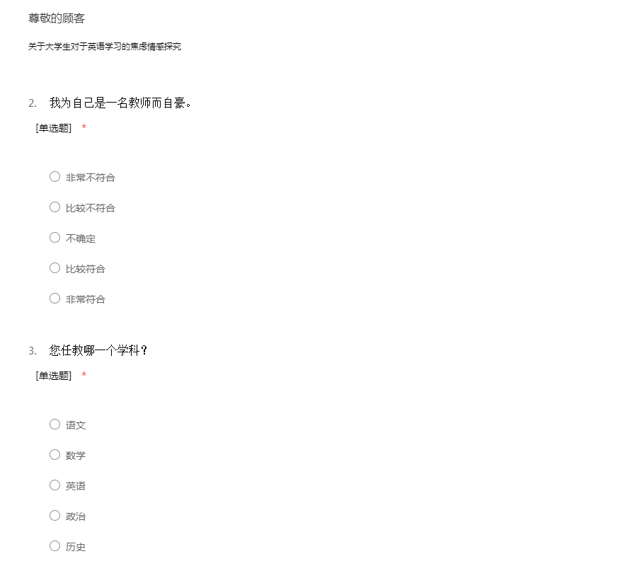 为了解您对我校教师现状的看法,为了解您对学校管理、教学工作与生活的看法与感受,恭请按您真实的情况,客观地回答本问卷所提出的问题,表达您真实的看法。本问卷为不记名式,所有回答没有正误之分。衷心感谢您对学校工作的关注与帮助。