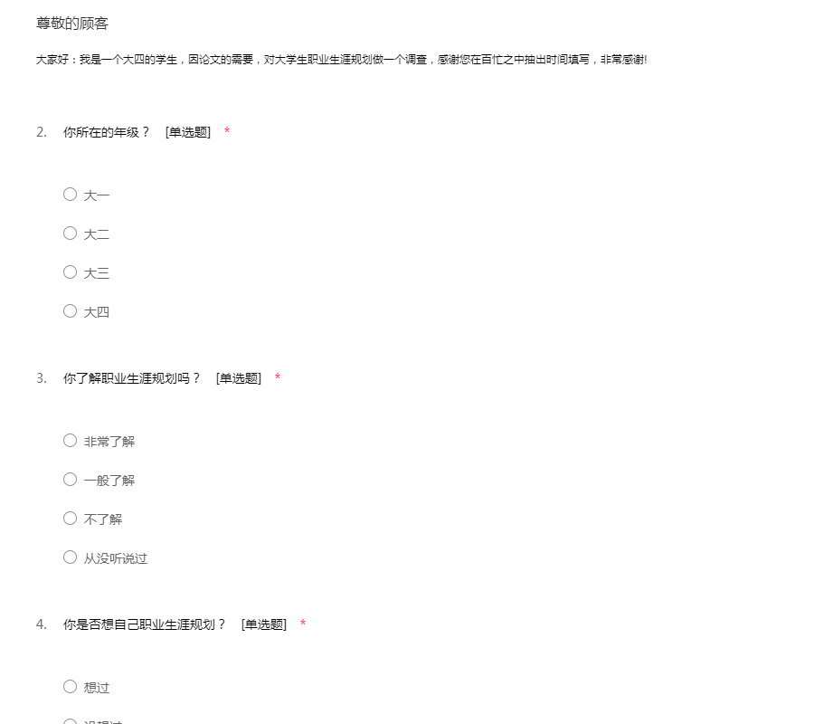 大家好:我是一个大四的学生,因论文的需要,对大学生职业生涯规划做一个调查,感谢您在百忙之中抽出时间填写,非常感谢!
