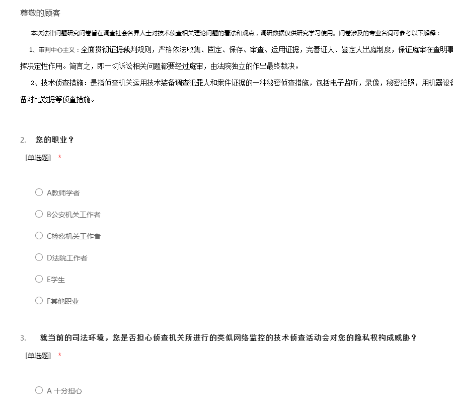 本次法律问题研究问卷旨在调查社会各界人士对技术侦查相关理论问题的看法和观点,调研数据仅供研究学习使用。问卷涉及的专业名词可参考以下解释: 1、审判中心主义:全面贯彻证据裁判规则,严格依法收集、固定、保存、审查、运用证据,完善证人、鉴定人出庭制度,保证庭审在查明事实、认定证据、保护诉权、公正裁判中发挥决定性作用。简言之,即一切诉讼相关问题都要经过庭审,由法院独立的作出最终裁决。 2、技术侦查措施:是指侦查机关运用技术装备调查犯罪人和案件证据的一种秘密侦查措施,包括电子监听,录像,秘密拍照,用机器设备排查、传送个人情况数据以及用机器设备对比数据等侦查措施。