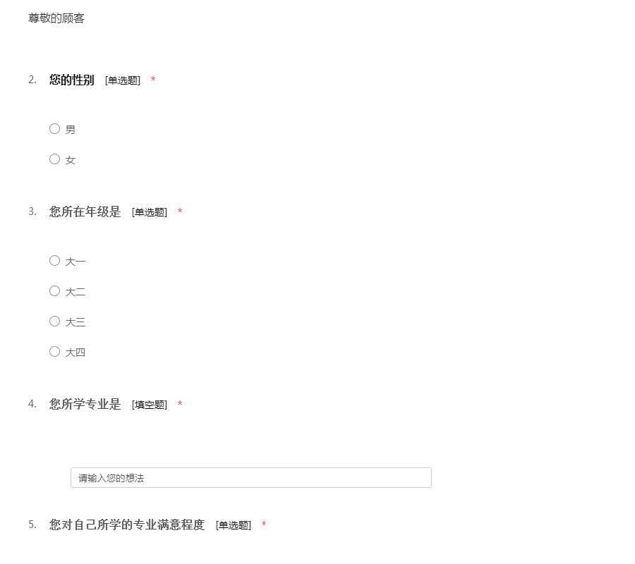 亲爱的同学:您好,为了解学生会工作情况,做此次调查。希望能够得到您的支持与协助。 本次调查采取无记名方式调查,所有回答只用于统计分析,您只需根据自己的实际情况,选上您认为合适的选项,或填写您认为适合的答案。您的所有回答我们都会替您保密,请您放心填写,耽误您的宝贵时间,我们深表歉意!