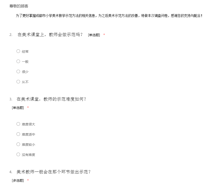 为了更好掌握成都市小学美术教学示范方法的相关信息,为之后美术示范方法的改善,特做本次调查问卷,感谢您的支持与配合!