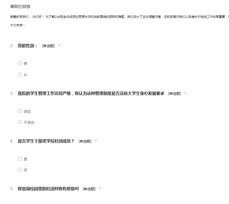 亲爱的同学们: 你们好! 为了解164班全体成员的思想状况和当前面临的困惑和难题,我们设计了这份调查问卷,您的回答对我们以后有针对性地工作非常重要,请您认真如实填写。衷心地感谢您对我们工作的大力支持!