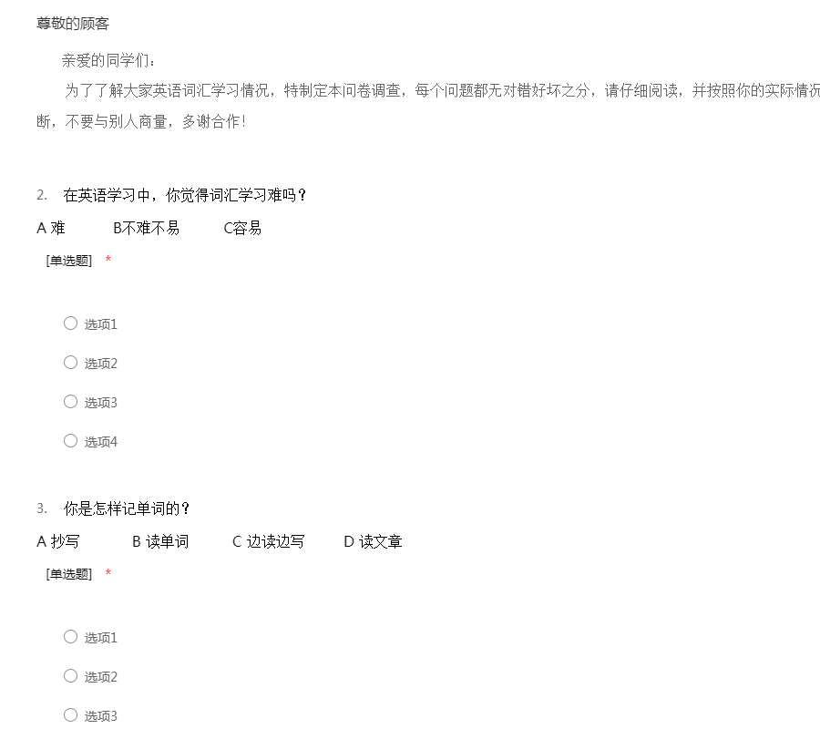 亲爱的同学们: 为了了解大家英语词汇学习情况,特制定本问卷调查,每个问题都无对错好坏之分,请仔细阅读,并按照你的实际情况填上选项。在选择答案时,要果断,不要与别人商量,多谢合作!