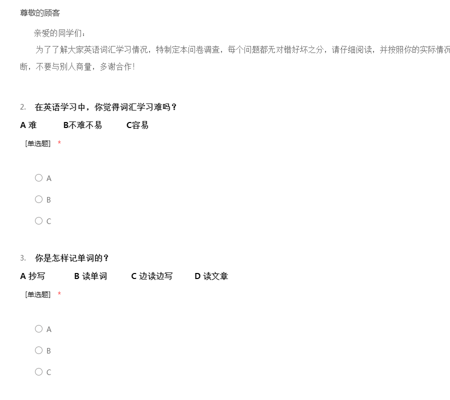 中学英语词汇学习调查问卷